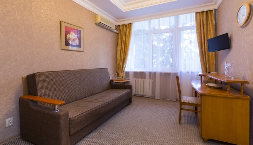 Номер оснащён двуспальной кроватью, односпальными кроватями, диваном (который также может служить раскладушкой), прикроватными тумбочками, журнальным столиком, столом, шкафом-купе и зеркалом.