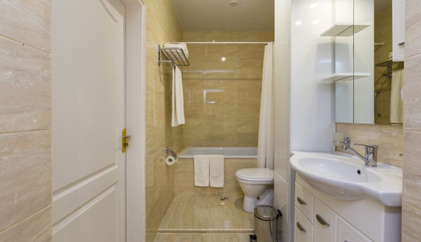 Ванная комната оснащена всем необходимым: есть ванна и фен.